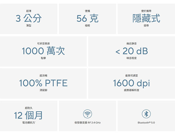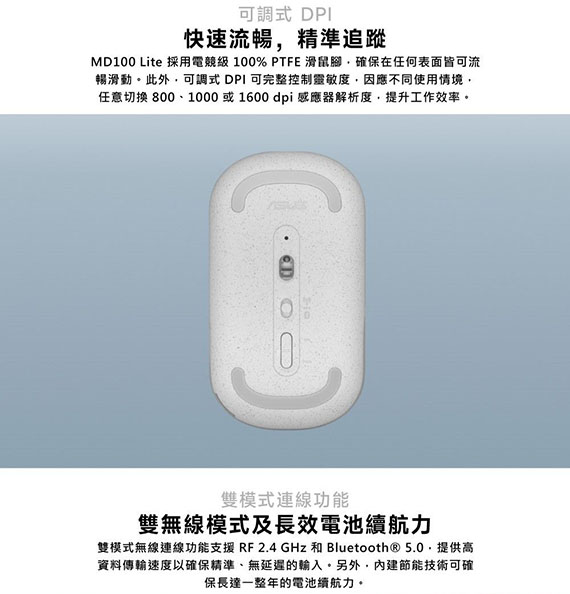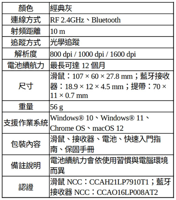 雙模式無線連線功能支援RF 2.4 GHz和Bluetooth 5.0,任意切換800、1000或1600 DPI感應器解析度,低噪音微動開關設計,採用電競級100% PTFE滑鼠腳,一年保固 滑鼠 NCC 認證:CCAH21LP7910T、,藍芽接收器 NCC 認證:CCAO16LP008AT2