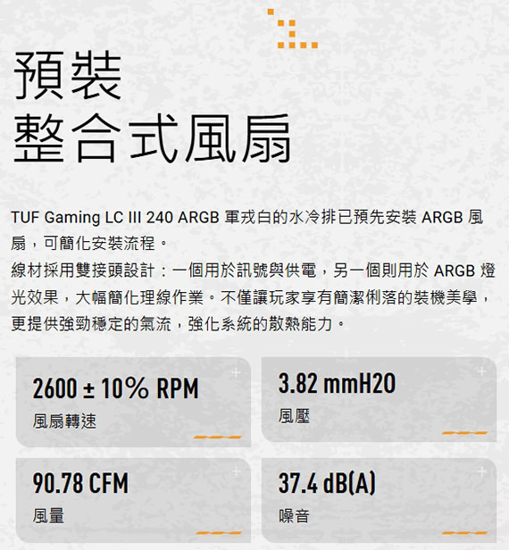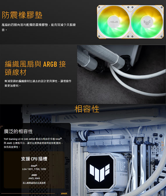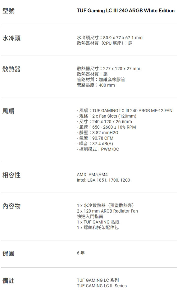 INTEL:LGA 1851、1700、1200,AMD:AM5、AM4,TUF GAMING LC III 240 ARGB MF-12風扇,風扇尺寸240*120*26.6mm,風速:650-2600+/-10%,噪音:37.4 dB(A),靜壓:3.82mmH2O,散熱器尺寸277*120*27mm,更高的風量與靜壓可提供全面的效能提升,預先安裝的整合式風扇,使用壽命最高提升兩倍,強化編織 400mm 水冷管設計,幫浦升級為三相、六槽、四極設計,保固6年