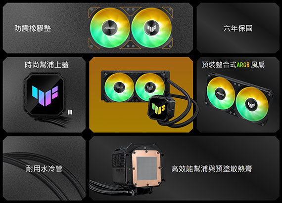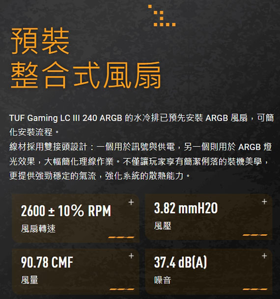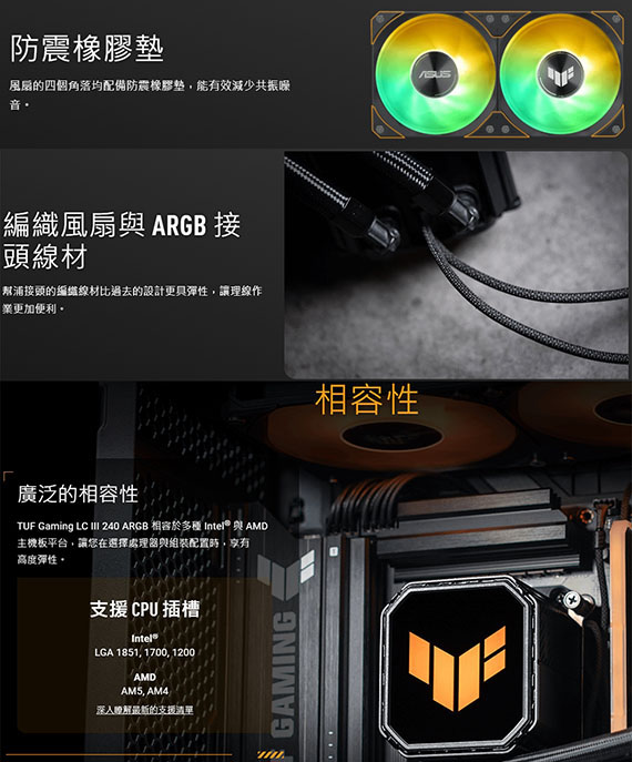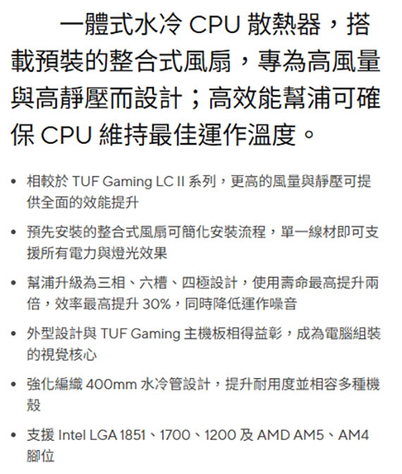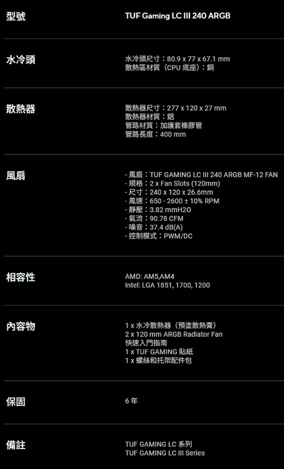 INTEL:LGA 1851、1700、1200,AMD:AM5、AM4,TUF GAMING LC III 240 ARGB MF-12風扇,風扇尺寸240*120*26.6mm,風速:650-2600+/-10%,噪音:37.4 dB(A),靜壓:3.82mmH2O,散熱器尺寸277*120*27mm,更高的風量與靜壓可提供全面的效能提升,預先安裝的整合式風扇,使用壽命最高提升兩倍,強化編織 400mm 水冷管設計,幫浦升級為三相、六槽、四極設計,保固6年
