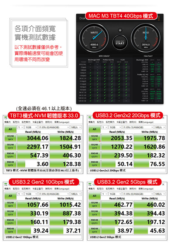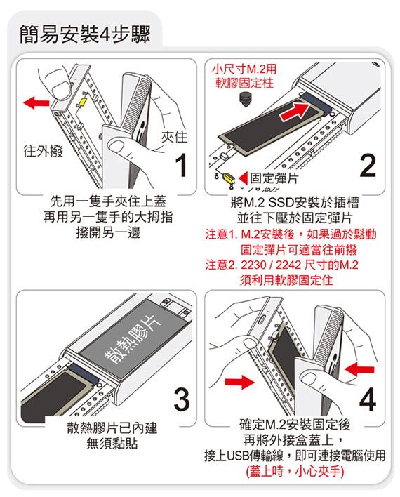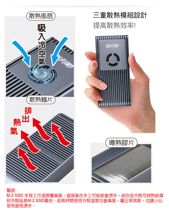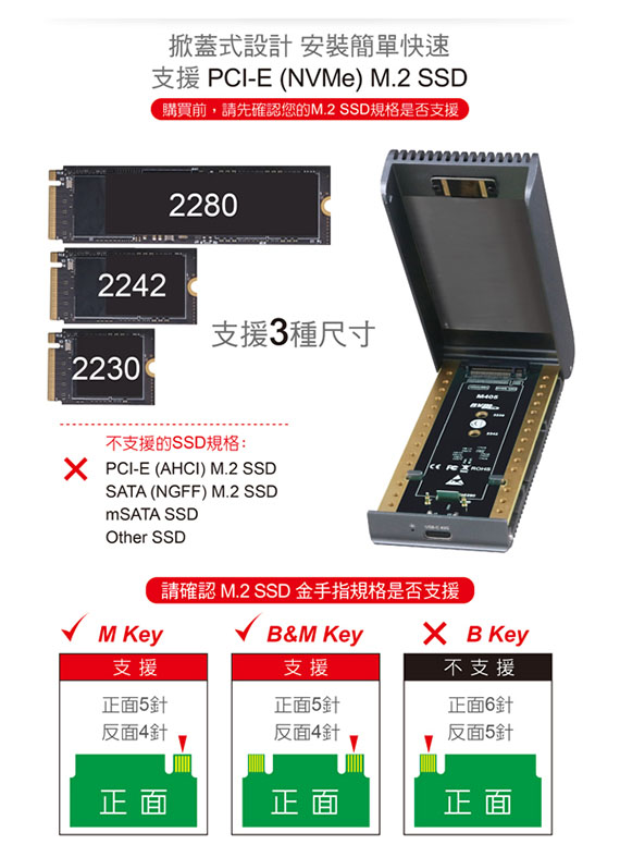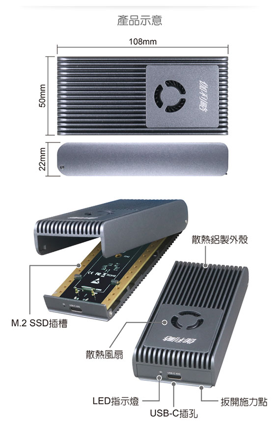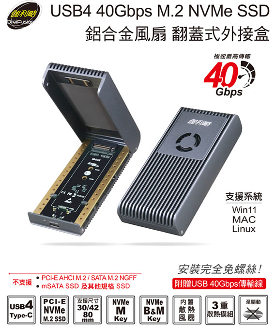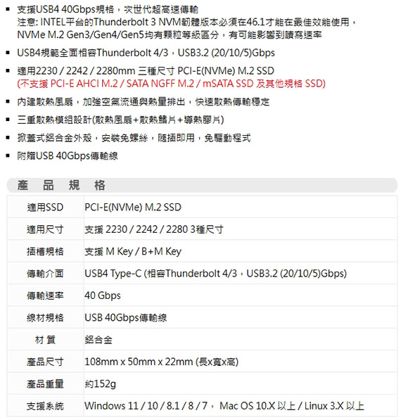 USB4 Type-C 40Gbps規格,相容Thunderbolt 4/3、USB3.2 (20/10/5)Gbps,適用2230/2242/2280mm三種尺寸PCI-E(NVMe) M.2 SSD,內建散熱風扇,三重散熱模組設計,掀蓋式鋁合金外殼,安裝免螺絲,隨插即用