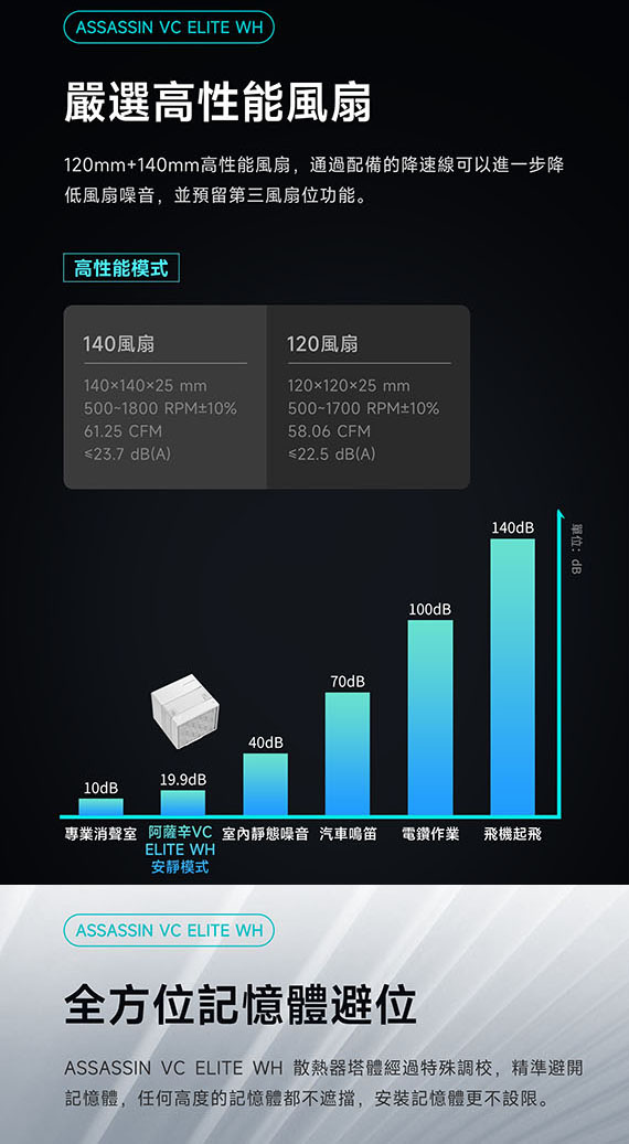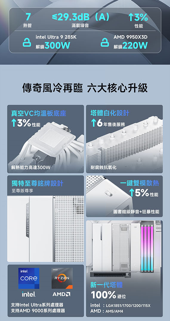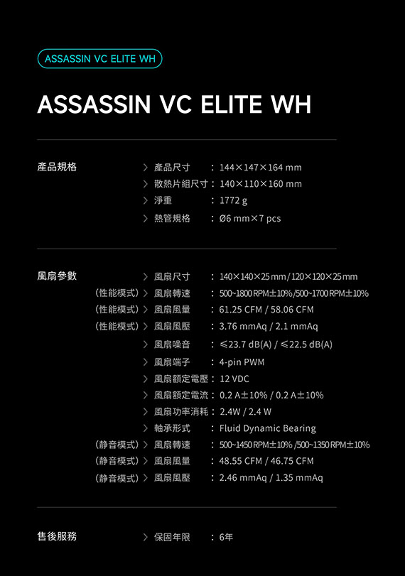 Intel:LAG 1851/1700/1200/1151/1150/1155,AMD:AM4/AM5,風扇:140*140*25mm/120*120*25mm,風量61.25/58.06CFM,轉速500~1800RPM±10%,噪音≦23.7dBA,散熱器尺寸(含扇):144*147*164mm,風扇採用三相六極變頻電機馬達,創新 VC 均熱底座,機頂可控雙模設計,原廠6年保固