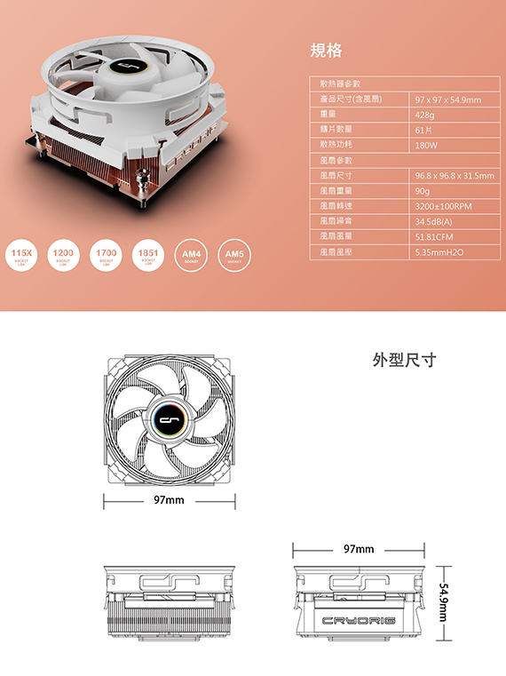 CPU腳位:intel LGA 115X/1200/1700/1851、AMD AM5/AM4,風扇尺寸96.8*96.8*31.5mm,風量51.81CFM,轉速3200±100RPM,噪音34.5dBA,風扇壓5.35mmH2O,產品尺寸97*97*54.9(L*W*H)mm,全銅 VC 散熱底座,側邊簍空設計,AI 伺服器散熱技術,風扇快扣設計,巧妙鰭片高度與間隙