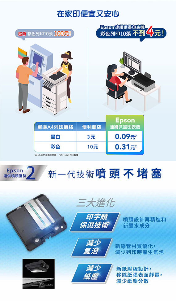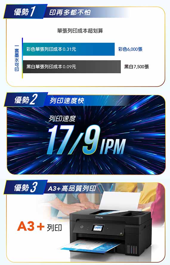 A4,無線/雲端列印,列印/影印/掃描,列印:黑白33ppm/彩色15ppm,影印:黑白7.7ipm/彩色3.8ipm,掃描(CIS)1200dpi,速度(A4 200dpi):黑白11秒彩色28秒,USB2.0,WIFI,google cloud print,耗材:T03Y100(黑色防水)/T03Y200藍/T03Y300紅/T03Y400黃