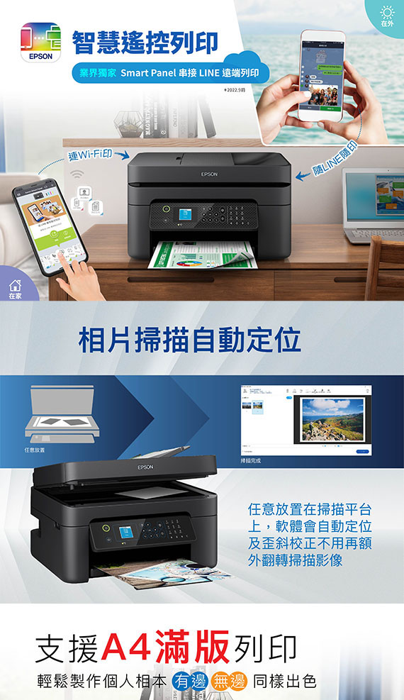 A4,自動雙面/無線/行動裝置/雲端;列印/影印/掃描/傳真;列印5760x1440dpi,速度:黑白33ppm/彩色18ppm;影印速度:黑白7.7ipm/彩色3.8ipm;掃描(CIS/平台式)1200x2400dpi,速度4.5ipm黑白16秒/彩色34秒;黑白和彩色傳真,記憶體可達100頁空間,Hi-Speed USB 2.0,無線網路,Wi-Fi,支援Epson Smart Panel,1.44吋彩色LED,耗材T10J150黑/T10J250藍/T10J350紅/T10J450黃,產地:印尼,1年保固