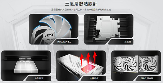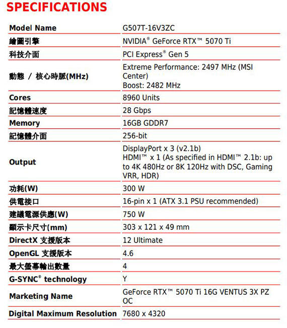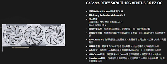 PCI-E 5.0,NVIDIA GeForce RTX 5070 Ti,16GB GDDR7,256-bit,引擎時脈(MHz):2497(MSI Center)/2482(Boost),記憶體時脈(Gbps):28,介面:HDMI(2.1b)*1,DisplayPort(2.1b)*3,搭載NVIDIA Blackwell架構與DLSS,SFF-Ready Enthusiast GeForce Card,無痕供電路徑,金屬磁吸背板,TORX Fan 5.0,鍍鎳銅底座,方形熱管,MSI Center軟體,Afterburner軟體,背插版,3年保固