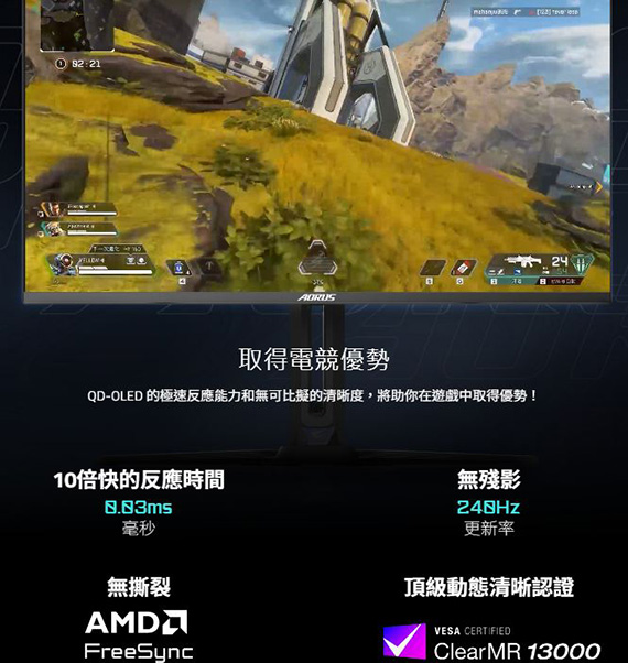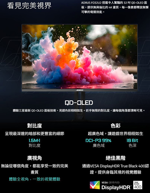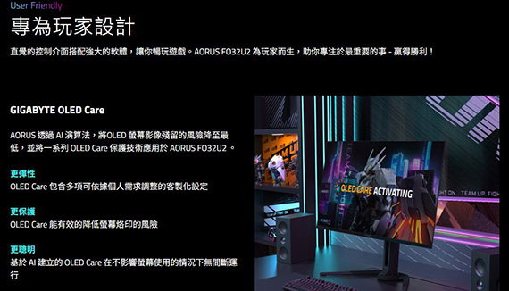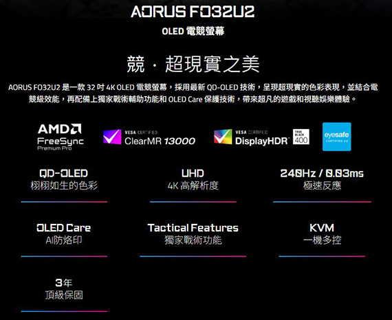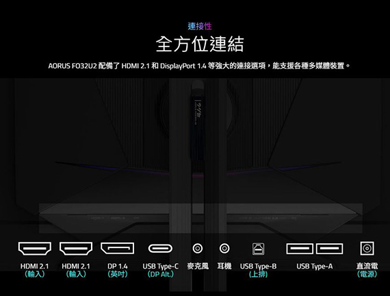 Gigabyte技嘉 AORUS FO32U2 32型 16:9 31.5吋 4K 240Hz電競螢幕 (OLED/0.03ms/2H1DP/喇叭/HDR400/KVM/可升降、旋轉)