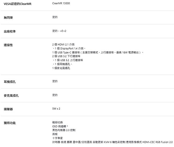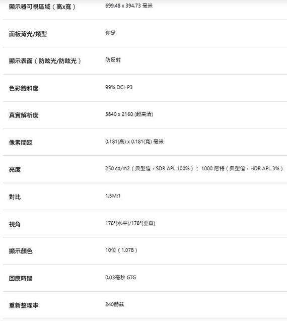 31.5吋、16:9寬螢幕、OLED面板、解析度3840x2160(4K UHD/QFHD 2160P)、更新率240Hz、反應時間0.03ms(GTG)、對比1.5M:1、亮度250~1000cd/m2、輸入介面:HDMI(2.1)*2、DisplayPort(1.4)*1、支援HDCP、Type-C*1、USB 3.2*3、MIC*1、耳機*1、內建5W*2喇叭、ClearMR 13000、VESA DisplayHDR True Black 400、KVM一機多控、Tactical Features獨家戰術功能、AI防烙印、可升降旋轉
