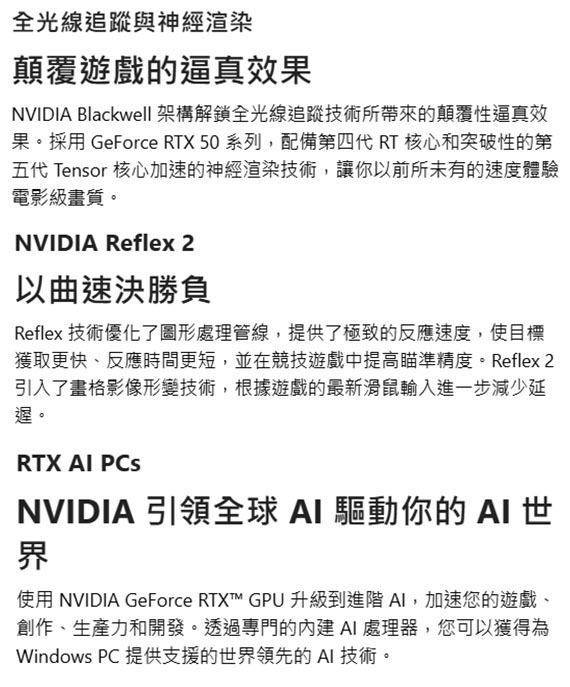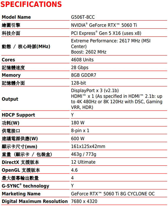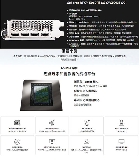 PCI-E 5.0,NVIDIA GeForce RTX 5060 Ti,8GB GDDR7,128-bit,引擎時脈(MHz):2617(MSI Center)/2602(Boost),記憶體速度28Gbps,介面:HDMI(2.1b)*1、DisplayPort(2.1b)*3,尺寸161*125*42mm,搭載NVIDIA Blackwell架構與DLSS 4,CYCLONE風格散熱設計,經過優化的扇葉設計,客製化PCB,微星獨家MSI Center,Afterburner 軟體