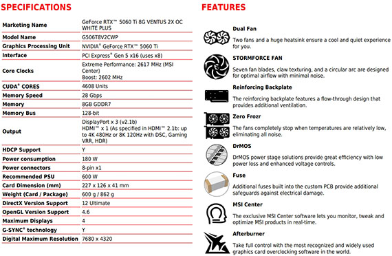 PCI-E 5.0,NVIDIA GeForce RTX 5060 Ti,GB GDDR7,128-bit,引擎時脈(MHz):2617(MSI Center)/2602(Boost),記憶體速度28Gbps,介面:HDMI(2.1b)*1、DisplayPort(2.1b)*3,尺寸227*126*41mm,採用NVIDIA Blackwell架構和DLSS 4技術,MSI Center 獨家軟體,Afterburner軟體,七個風扇葉片,熱管設計用於高效散熱,加強背板