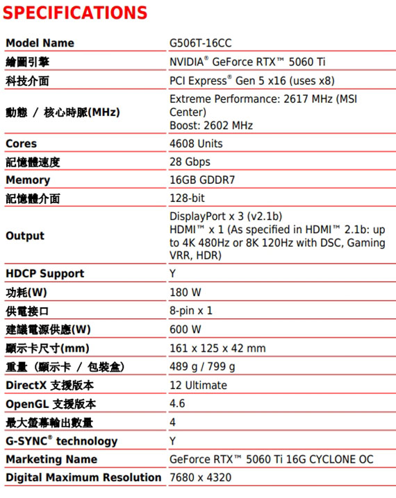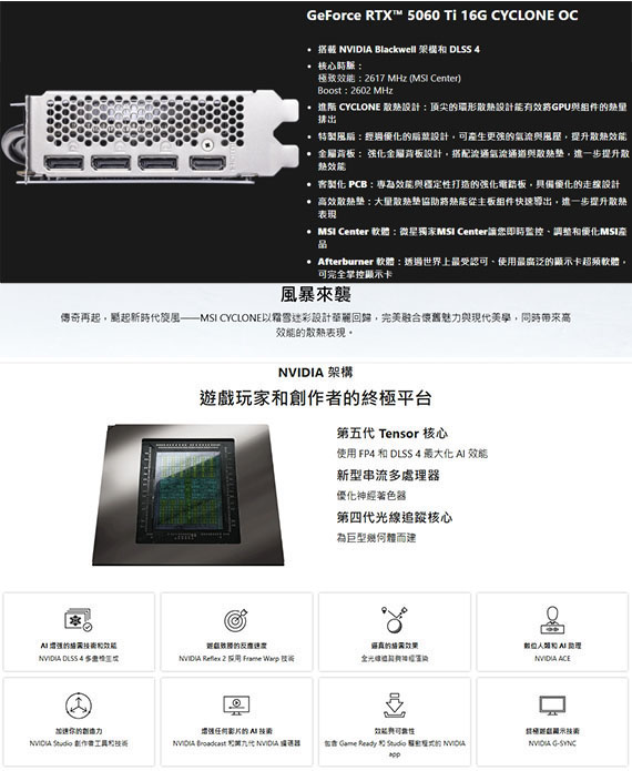 PCI-E 5.0,NVIDIA GeForce RTX 5060 Ti,16GB GDDR7,128-bit,引擎時脈(MHz):2617(MSI Center)/2602(Boost),記憶體時脈(Gbps):28,介面:HDMI(2.1b)*1,DisplayPort(2.1b)*3,第五代Tensor核心,第四代光線追蹤核心,搭載 NVIDIA Blackwell 架構和 DLSS 4,進階 CYCLONE 散熱設計,優化的扇葉設計提升散熱效能,金屬背板,客製化PCB,高效散熱墊,MSI Center軟體,Afterburner軟體
