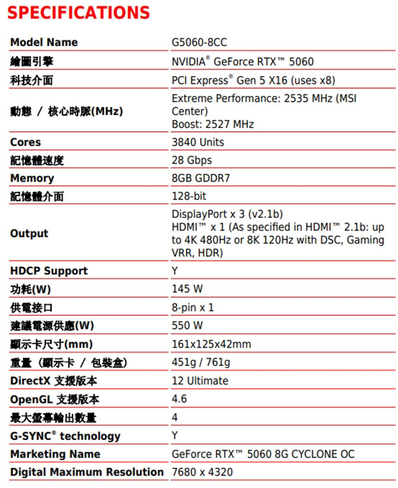 PCI-E 5.0,NVIDIA GeForce RTX 5060,8GB GDDR7,128-bit,引擎時脈(MHz):2535(MSI Center)/2527(Boost),記憶體速度28Gbps,介面:DisplayPort(v2.1b)*3,HDMI(2.1b)*1,尺寸161x125x42mm, 搭載 NVIDIA Blackwell架構和 DLSS 4,進階 CYCLONE 散熱設計,優化的扇葉設計,產生更強的氣流與風壓,提升散熱效能,堅固背板,客製化PCB,高效散熱墊,MSI Center軟體,Afterburner 軟體