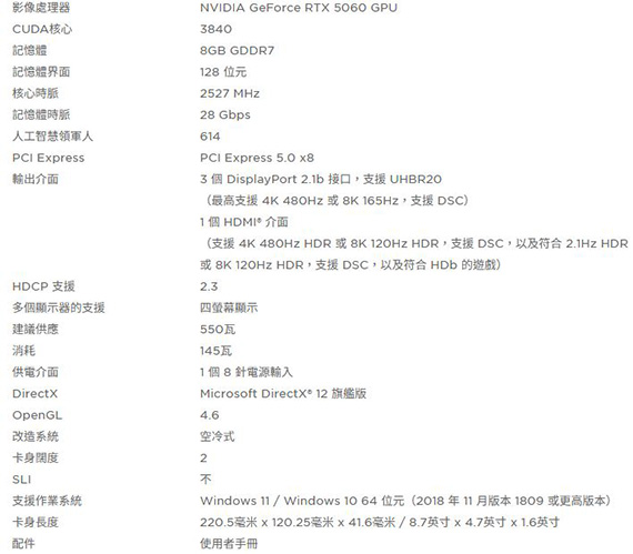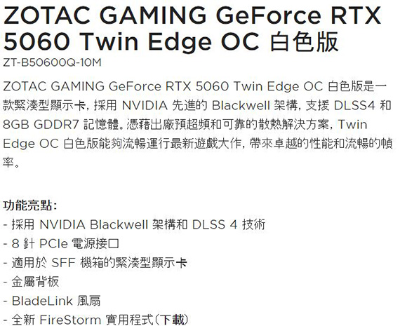 PCI-E 5.0,NVIDIA GeForce RTX 5060,8GB GDDR7,128-bit,引擎時脈(MHz):2527,記憶體時脈(Gbps):28、介面:HDMI(2.1b)*1、DisplayPort(2.1b)*3,採用 NVIDIA Blackwell架構和DLSS4技術,適用於SFF的緊湊型卡,IceStorm 2.0 增強型冷卻,白色LED照明,BladeLink 風扇,金屬背板,全新FireStorm監控及微調軟件,3+2年保固