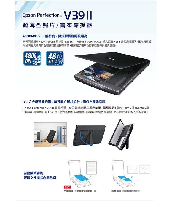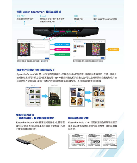 掃描解析度4800x4800dpi;速度:黑白10.4秒/彩色9.9秒 (300dpi),操作面版結合Epson ScanSmart軟體功能,新增自動裁減文件檔案功能,3.9公分超薄簡約黑,特殊直立腳柱設計,獨家相片自動定位與自動歪斜校正,上蓋直接移除,輕鬆掃描厚重書本,指定顏色移除功能
