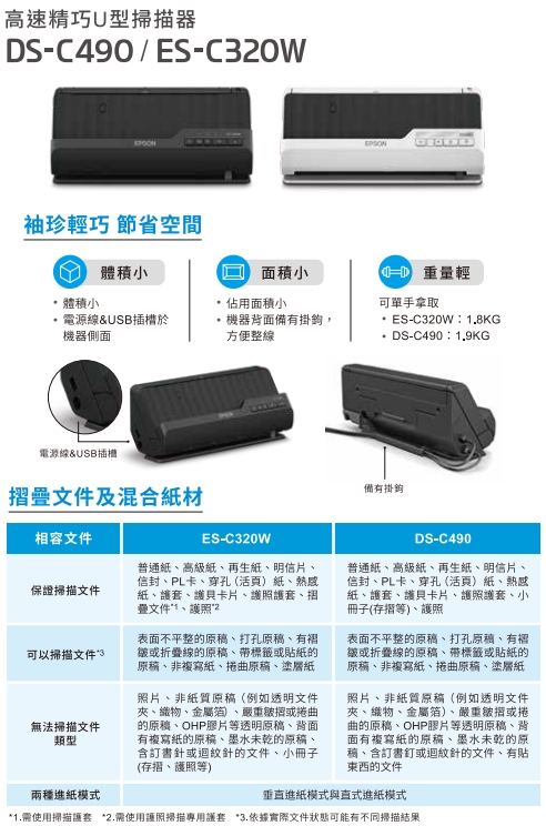 A4,反射稿,可掃摺疊文件,護照、收據、發票、卡片...等, 雙面掃描,掃描彩色/灰階/黑白,饋紙式,CIS,超聲波傳感器,解析度:600x600dpi,色彩位元:取樣30bit/輸出24bit, USB2.0, 緊湊U型設計袖珍輕巧省空間設計,跳過空白頁,A3拼接,去除打孔,自動傾斜校正, 掃描到:電子郵件、FTP、Microsoft SharePoint、打印、Web文件夾、網絡文件夾、USB、電腦