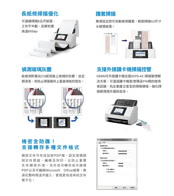 A4,雙面掃描,掃描彩色,饋紙式/CIS,解析度:最大1200dpi, USB 3.2,有線乙太網路,無線Wi-Fi, 高速掃描最高達45ppm/90ipm,4.3吋觸控螢幕,單向一次可放置100張完成大量文件掃描,多樣紙材及卡片混搭掃描,紙張保護功能,透過ScanWay技術無須連接PC即可掃描,BSMI:R33126