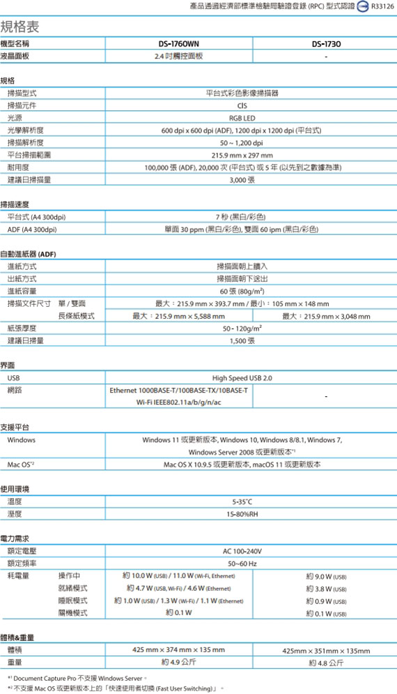 掃描尺寸:平台215.9x297 mm/自動送紙器105x148 ~ 215.9x3048mm,雙面掃描,平台+饋紙式/CIS,掃描彩色/灰階/黑白/彩色,解析度:平台式1200dpi/ADF 600dpi,USB2.0,ADF掃描:100000張,ADF速度提升20%,平台式掃描速度提升15%,多文件/混合尺寸原稿自動裁切,提供雙光源掃描,支援影像修正