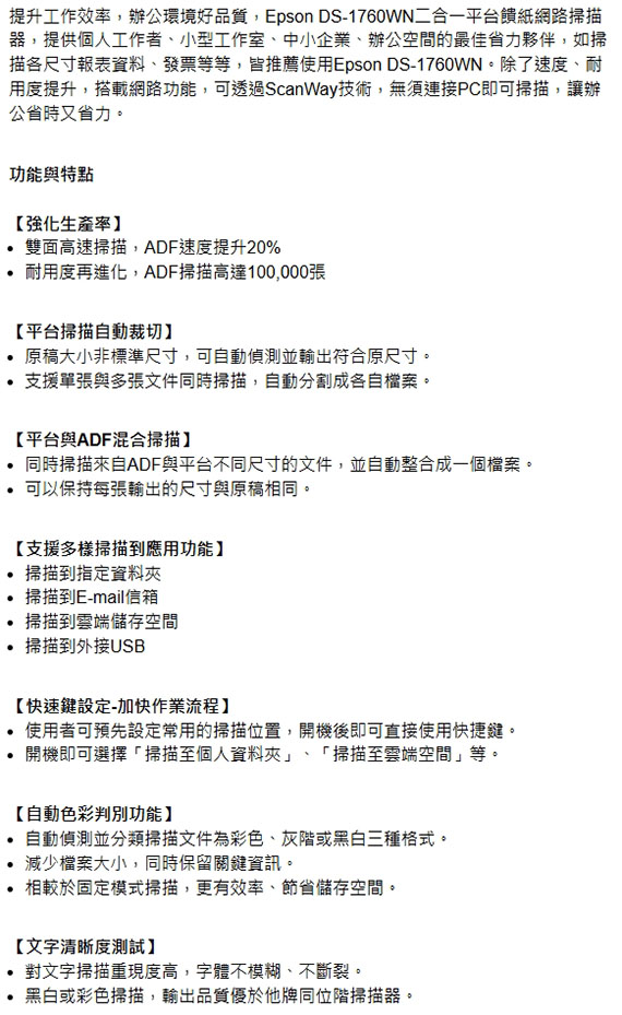 EPSON愛普生 DS-1760WN 平台+饋紙掃描器/A4