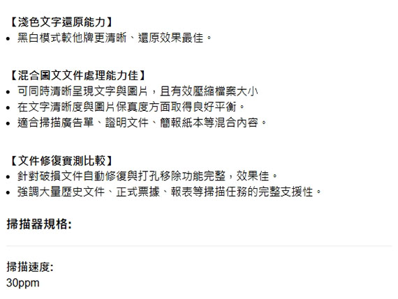 掃描尺寸:平台215.9x297 mm/自動送紙器105x148 ~ 215.9x5588mm,雙面掃描,平台+饋紙式/CIS,掃描彩色/灰階/黑白/彩色,解析度:平台式1200dpi/ADF 600dpi,USB2.0,WiFi,Ethernet 10BASE-T/100BASE-TX/1000BASE-T,2.4吋觸控面板,ADF掃描:100000張,ADF速度提升20%,平台式掃描速度提升15%,多文件/混合尺寸原稿自動裁切,提供雙光源掃描,支援影像修正,搭載網路功能