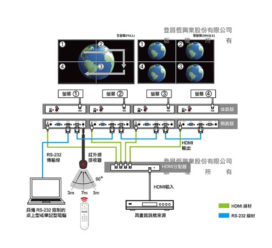 多台具備HDMI端子的LCD螢幕,支援多種螢幕數量組合,例如 2×2、3×3、4×4或5×5電視牆。本產品內建影像升頻器,可以輕易地將訊號來源裝置的高解析度或是
