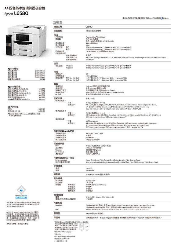 A4,自動雙面/行動遠端/雲端列印,列印/影印/掃描/傳真,列印:4800x1200dpi,速度:黑白32ppm/彩色32ppm,影印速度(平台式):黑白23ipm,彩色23ipm,掃描解析度:1200x2400 dpi,掃描速度:黑白A4 200dpi 5秒(平台式),彩色A4 200dpi 10秒(平台式),傳真速度:33.6kps,界面:USB 2.0 /乙太網路/Wireless/Wi-Fi/,TCP/IPv4,TCP/IPv6,耗材:C13T07M150(黑)/C13T07M250(藍)/C13T07M350(紅)/C13T07M450(黃),保固一年