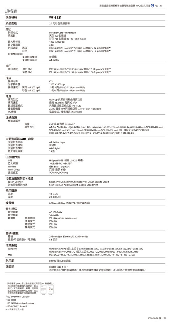 A4,自動雙面/行動遠端/雲端 列印,列印/影印/掃描/傳真,列印:4800x2400dpi,速度:黑白35ppm/彩色21ppm,影印速度(平台式):黑白19ipm,彩色9ipm,掃描解析度:1200x2400 dpi,掃描速度:黑白 200dpi 5秒(平台式),彩色 200dpi 11秒(平台式),傳真速度:33.6kps,界面:USB/乙太網路/Wireless/Wi-Fi/,TCP/IPv4,TCP/IPv6,耗材:C13T05Y150(黑)/C13T05Y250(藍)/C13T05Y350(紅)/C13T05Y450(黃),保固一年