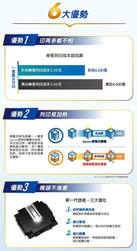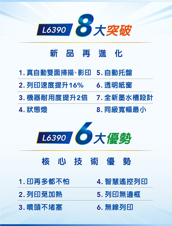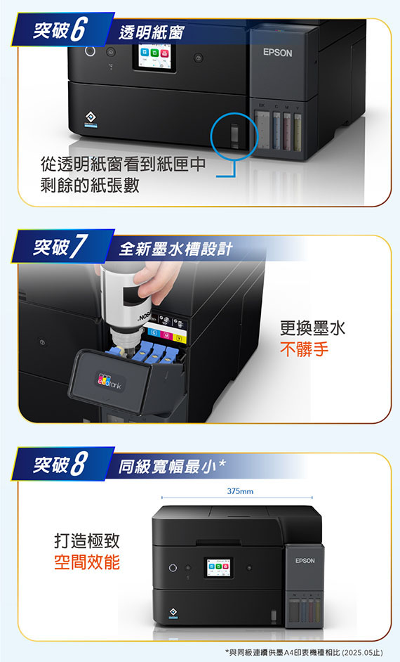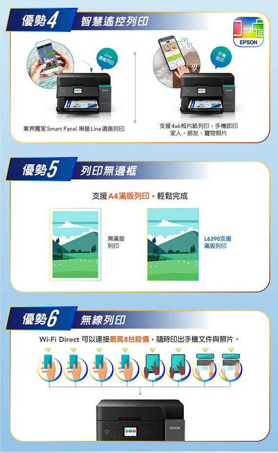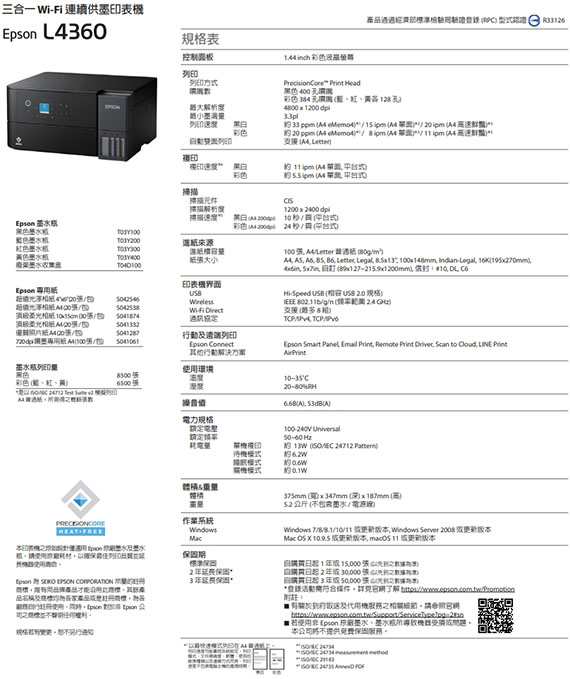 A4、連續供墨系統、無線/行動裝置/雲端列印、列印/掃描/影印/自動雙面列印、支援無邊界列印;列印4800x1200dpi、速度:黑白15ipm/彩色8ipm;影印600x600dpi、速度:黑白11ipm/彩色5.5ipm、掃描1200x2400dpi、速度:黑白10秒/彩色24秒、USB2.0、Wi-Fi IEEE 802.11b/g/n、Wi-Fi Direct、1.44吋彩色液晶屏、耗材:C13T03Y100黑、C13T03Y200藍、C13T03Y300紅、C13T03Y400黃