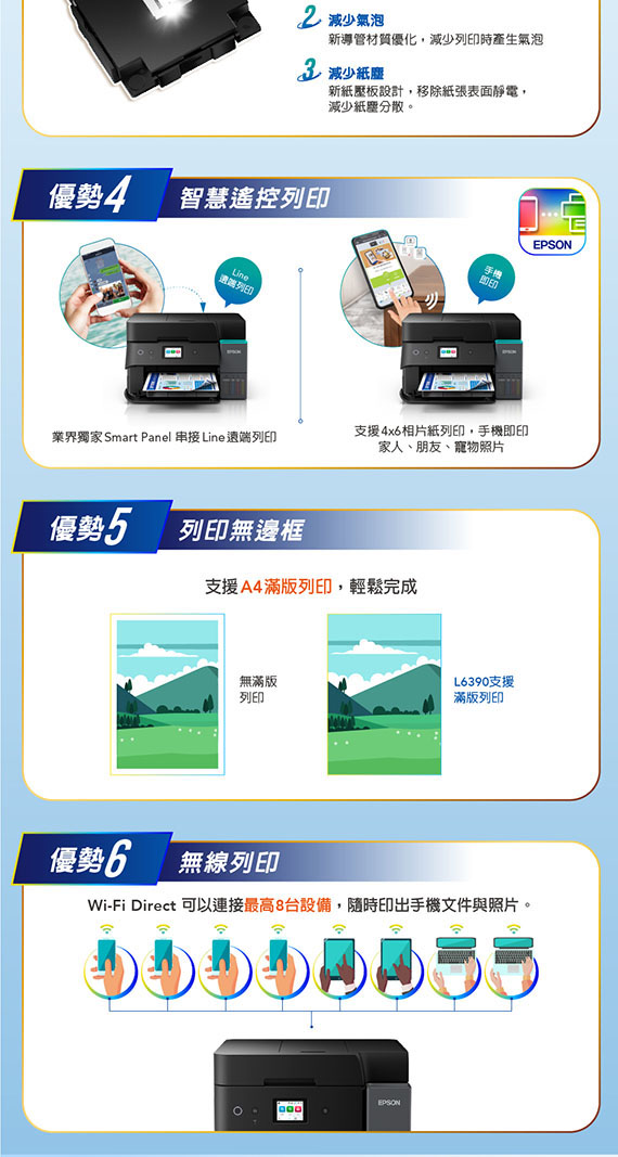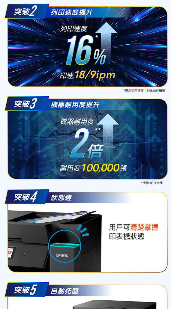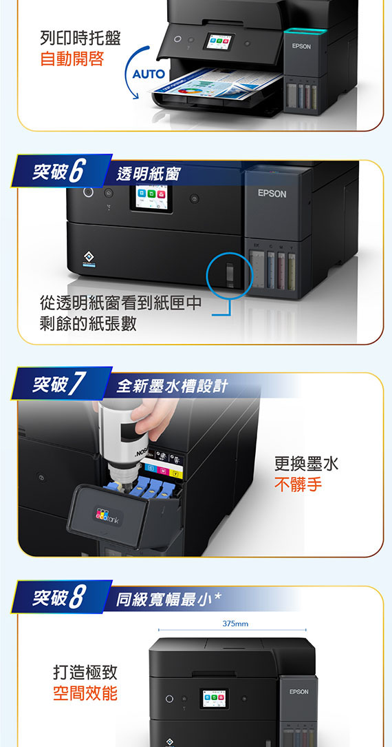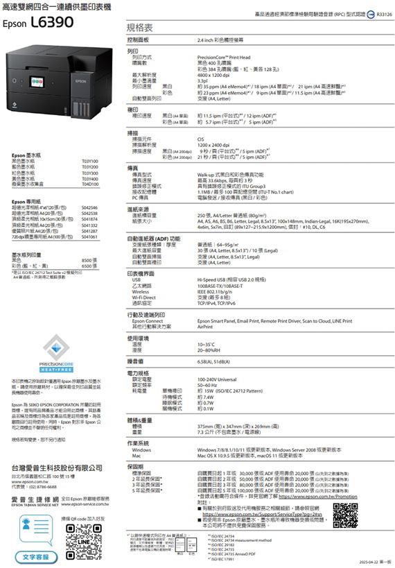 A4(支援無邊界列印)、連續供墨系統、無線/行動裝置/雲端列印、列印/掃描/影印/傳真/自動雙面列印;列印解析度4800x1200dpi、速度:黑白18ipm/彩色9ipm;影印解析度600x600dpi、速度:黑白11.5ipm/彩色5.7ipm、掃描1200x2400dpi、速度:黑白9秒/彩色21秒、;傳真解析度200x200dpi、每頁約3秒、1.1MB記憶體可達100頁、USB2.0、乙太網路、Wi-Fi IEEE 802.11b/g/n、Wi-Fi Direct、2.4吋彩色液晶屏、耗材:C13T03Y100黑、C13T03Y200藍、C13T03Y300紅、C13T03Y400黃