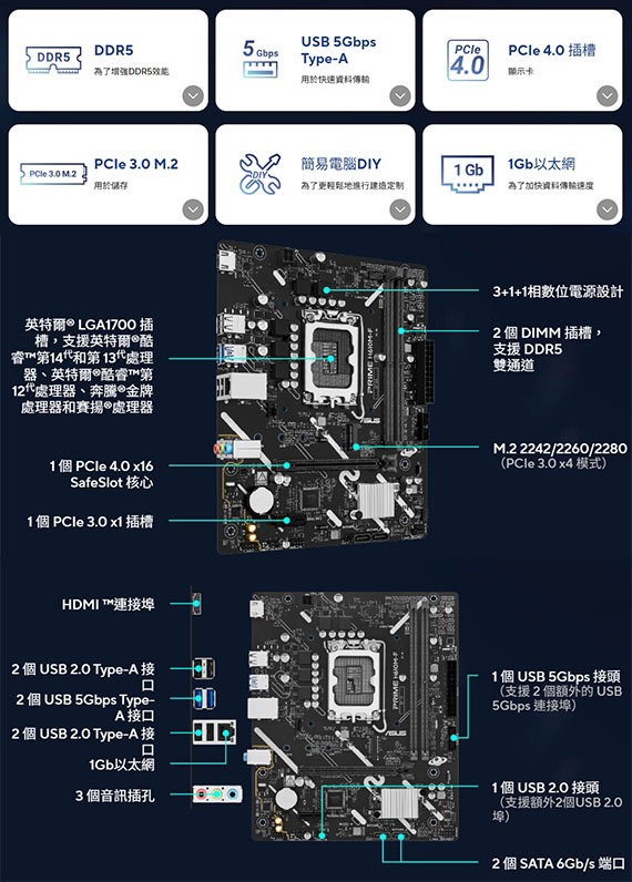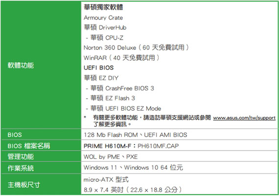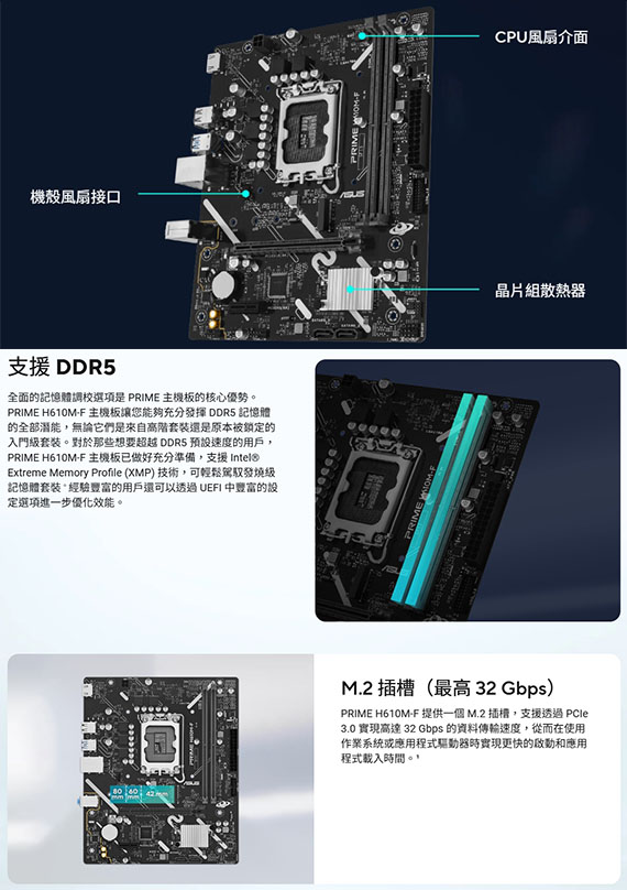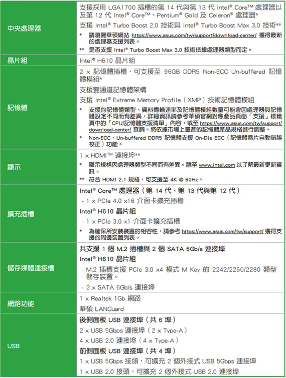 Intel H610 Chipset,2*DDR5 Max.96GB,1*PCIe 4.0x16slot,1*M.2,2*SATA 6Gb/s,1*HDMI2.1,Realtek 1Gb Ethernet,Realtek 7.1,I/O:6*Type-A,3*Audio jacks,m-ATX,設計上更涼爽,DIY友善,PBA推薦,需搭配CPU晶片才能使用內顯功能,三年保固,登錄四年(90MB1GK0-M0TAY0)