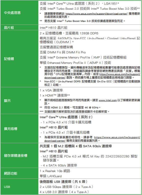 Intel H810 Chipset,2*DDR5 up to 6400MT/s max128GB,1*PCIe 4.0x16,1*M.2(PCIe4.0x4),4*SATA 6Gb/s ports,1* VGA,1*HDMI2.1,Realtek 1Gb Ethernet,Realtek 7.1,I/O:6*Type-A、3*Audio jacks,micro-ATX,專為高級 AI PC 而設計,實現全RGB燈光控制,DIY友善,需搭配CPU晶片才能使用內顯功能,三年保固,登錄四年(90MB1N10-M0TAYC)