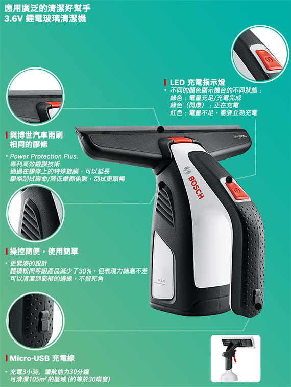 BOSCH 3.6V 鋰電玻璃清潔機 GlassVac (06008B7050)