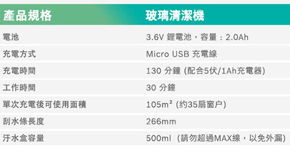 汙水盒容量:500ml,充電時間:130分鐘(5V/1Ah),USB充電,LED充電指示燈,專利塗層,多種刮水條,環境友好,較小磨擦力