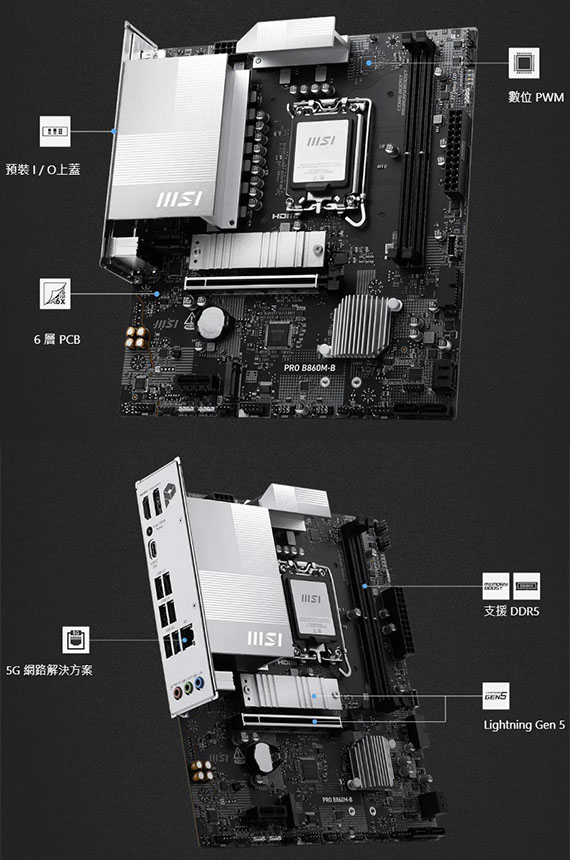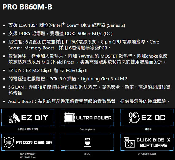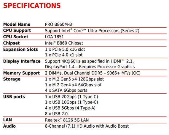 INTEL B860,DDR5*2(MAX.128GB),9066-6400(OC)MT/s、6400-4800(JEDEC)MT/s,PCI-E x16 slot*1,PCI-E x1 slot*1,M.2*2,SATA 6G*4, HDMI2.1*1,DisplayPort1.4*1,Realtek 8126 5Gbps LAN,Realtek ALC897 Codec,USB 2.0*8, USB 5Gbps Type A*4,USB 10Gbps Type A*1,Type C*2,mATX,LGA 1851,需搭配CPU晶片才能使用內顯功能