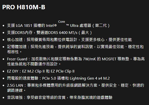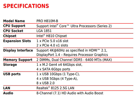 INTEL H810,DDR5*2(MAX.128GB)6400-4800(JEDEC)MT/s,PCI-E x16 slot*1,PCI-E x1 slot*2,M.2*2,SATA 6G*4, HDMI2.1*1,DisplayPort1.4*1,Realtek 8126 5Gbps LAN,Realtek ALC897 Codec,USB 2.0*8, USB 5Gbps Type A*4,Type C*1,mATX,LGA 1851,需搭配CPU晶片才能使用內顯功能