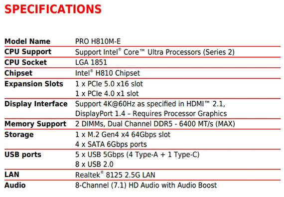 INTEL H810,DDR5*2(MAX.128GB)6400-4800(JEDEC)MT/s,PCI-E x16 slot*1,PCI-E x1 slot*1,M.2*2,SATA 6G*4, HDMI2.1*1,DisplayPort1.4*1,Realtek 8126 5Gbps LAN,Realtek ALC897 Codec,USB 2.0*8, USB 5Gbps Type A*4,Type C*1,mATX,LGA 1851,需搭配CPU晶片才能使用內顯功能
