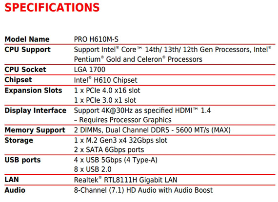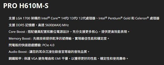 Intel H610、2*DDR5 5600(MAX.128GB)、1*PCIe x16、1*PCIe x1、1*M.2、2*SATA6Gb/s、HDMI1.4*1、Realtek RTL8111H Gigabit LAN、Realtek ALC897 7.1CH、4*Type-A、8*USB2.0、micro-ATX、需搭配CPU晶片才能使用內顯功能