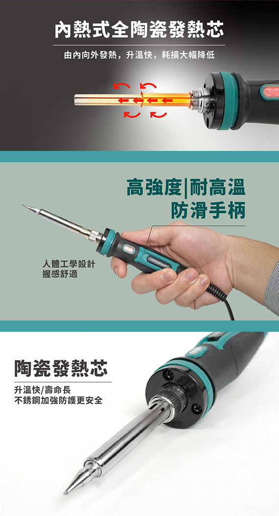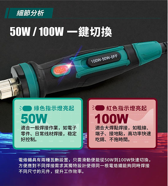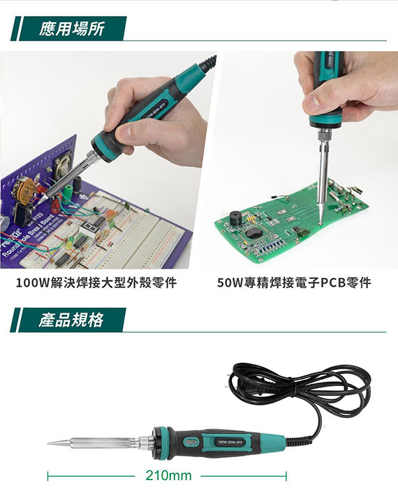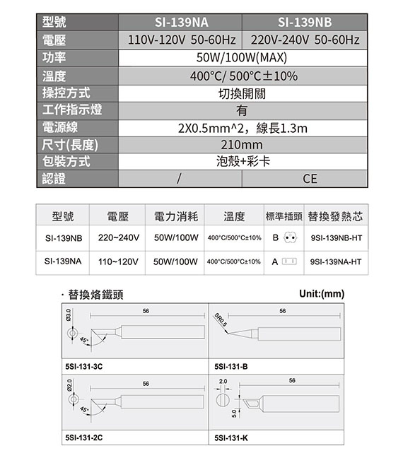 電源:110-120V,雙功率:50W(綠燈)、100W(紅燈),陶瓷發熱芯,溫度:400/500,插座A,線長1.3M,尺寸210mm,1年保固,選購烙鐵頭:5SI-131-3C、5SI-131-2C、5SI-131-B、5SI-131-K