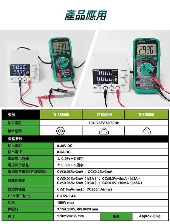 E Type-Plug(插座E),輸入電壓:104~253V,50/60Hz,單組輸出:0–30V / 0–5A,支援粗調與細調雙層精準控制,內建 USB 輸出:5V / 2.4A 適用於行動裝置,具備完整的保護機制,高品質 SMD 製程,功率150W max