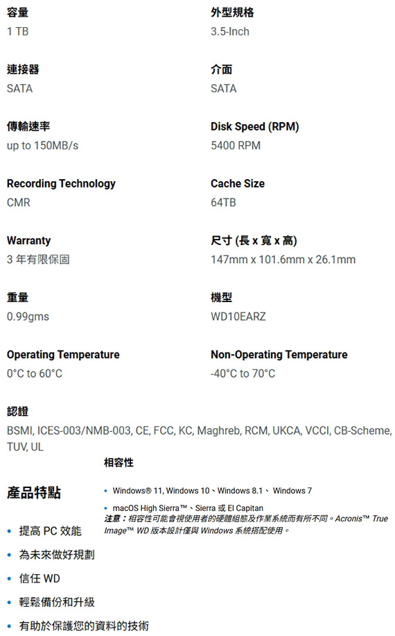 SATA 6.0Gb/s介面,轉速:5400rpm,64M 快取記憶體,Blue(藍標)系列,3.5吋規格尺寸,傳輸速率up to 150MB/s,CMR,三年保固