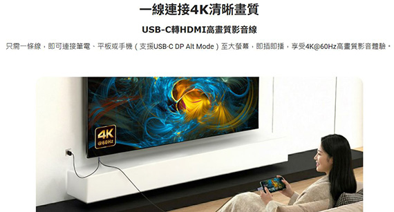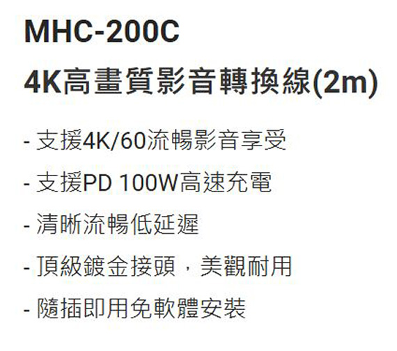 USB-C(公)---HDMI(公),線長:2公尺(2米)/200公分(200cm),支援4K/60流暢影音享受,支援PD 100W高速充電,清晰流暢低延遲,頂級鍍金接頭,隨插即用免軟體安裝,影像輸入USB-C(公):支援DP ALT MODE 的筆電、平板、手機皆可使用,影像輸出HDMI(公):4K@60(Source須能支援DP1.2,Display須能支援4K@60)