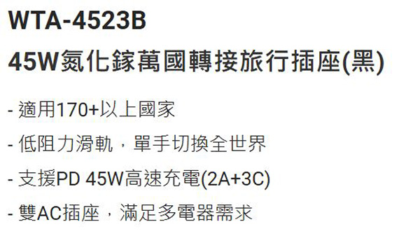 PX大通 WTA-4523B 黑色 氮化鎵45W AC TO USB充電器 電源轉換器