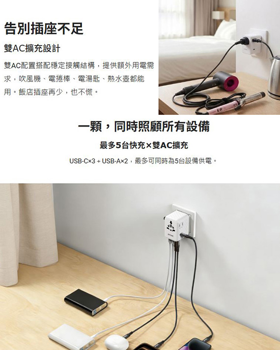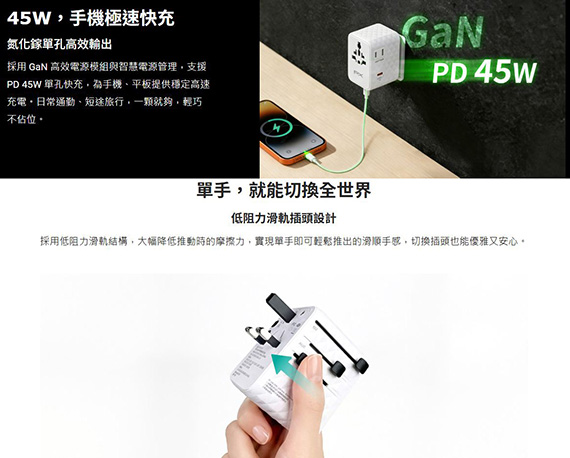 輸入:AC 100-250V,50/60Hz 1.8A,輸出:USB-C1 5V/A,9V/3A,12V/3A,15V/3A,20V/2.25A(45W),USB-C2 5V/3A(15W),USB-C3 5V/3A(15W), USB-A1/A2 5V/2.4A(12W),介面:Typ-C*3,USB-A*2,低阻力滑軌,支援PD 45W高速充電(2A+3C),雙AC插座,支援 170+國家插頭,氮化鎵單孔高效輸出,直覺式電源指示燈,尺寸L69*W55.5*H54.3mm,重量170g