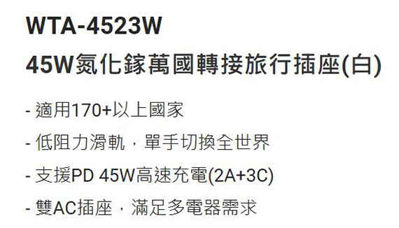 PX大通 WTA-4523W 白色 氮化鎵45W AC TO USB充電器 電源轉換器
