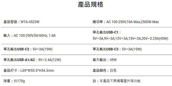 輸入:AC 100-250V,50/60Hz 1.8A,輸出:USB-C1 5V/3A,9V/3A,12V/3A,15V/3A,20V/2.25A(45W),USB-C2 5V/3A(15W),USB-C3 5V/3A(15W),USB-A1/A2 5V/2.4A(12W),介面:Typ-C*3,USB-A*2,低阻力滑軌,支援PD 45W高速充電(2A+3C),雙AC插座,支援 170+國家插頭,氮化鎵單孔高效輸出,直覺式電源指示燈,尺寸L69*W55.5*H54.3mm,重量170g
