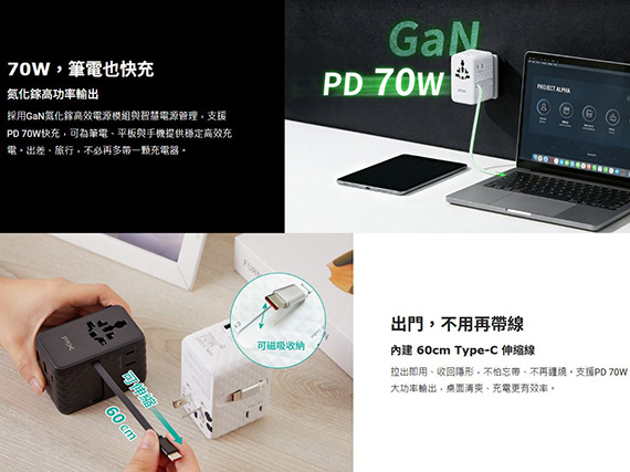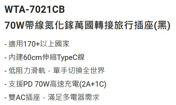PX大通 WTA-7021CB 黑色 氮化鎵70W AC TO USB充電器 電源轉換器(附60cmtypec線)
