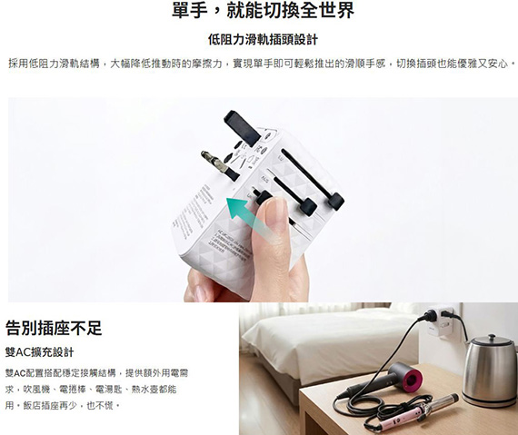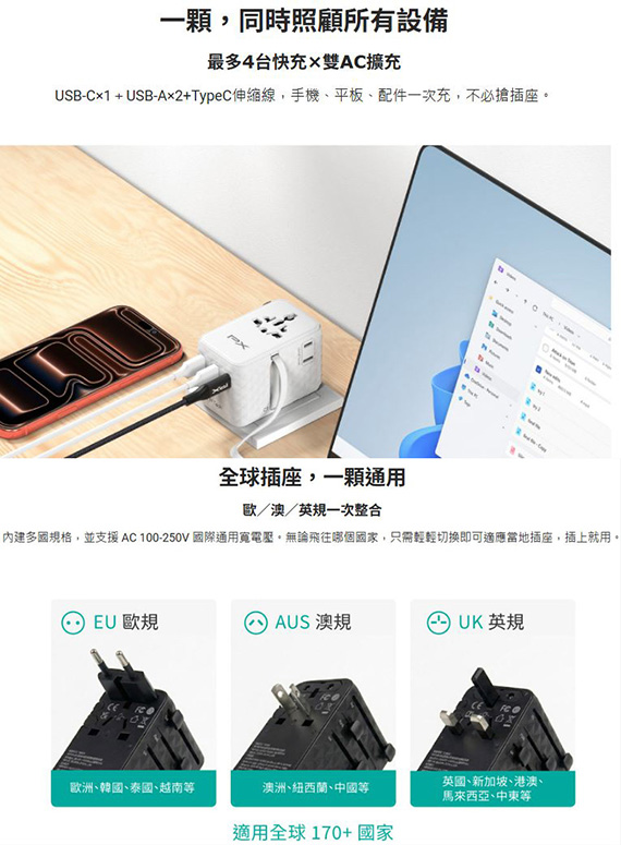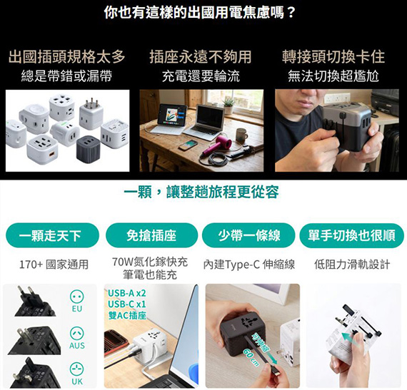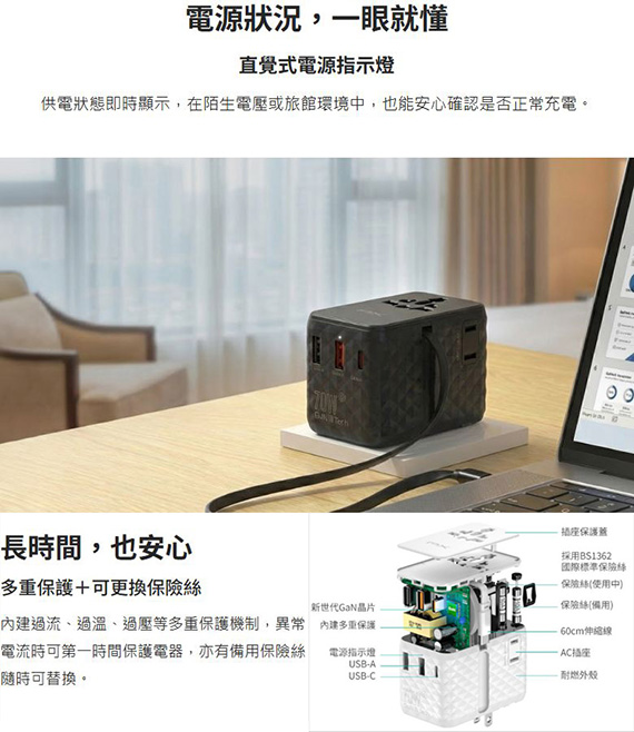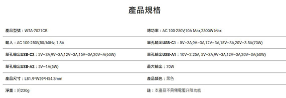 輸入:AC 100-250V,50/60Hz 1.8A,輸出:USB-C1 5V/3A,9V/3A,12V/3A,15V/3A,20V/3.5A(70W),USB-C2 5V/3A,9V/3A,12V/3A,15V/3A,20V/A(60W),USB-A1 10V/2.25A, 5V/3A,9V/3A,12V/3A,20V/3A(60W),USB-A2 5V?1A(5W),介面:Typ-C*1,USB-A*2,TypeC伸縮線,低阻力滑軌,內建60cm伸縮TypeC線,支援PD 70W高速充電(2A+1C),雙AC插座,適用170+以上國家,氮化鎵高功率輸出,尺寸L81.9*W59*H54.3mm,重量230g