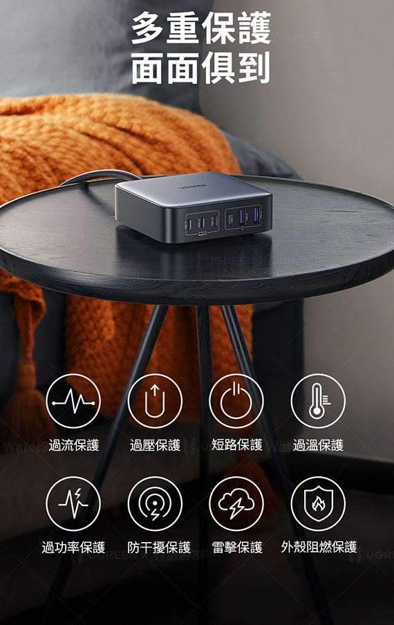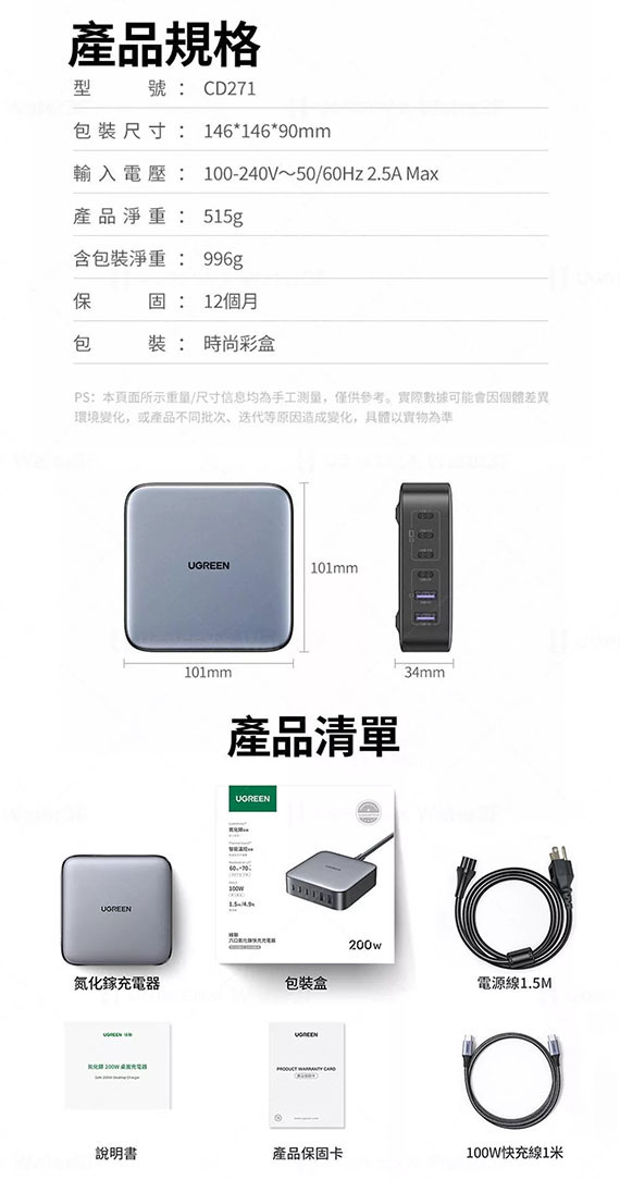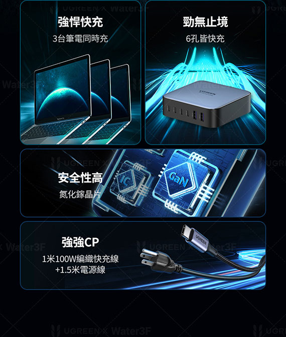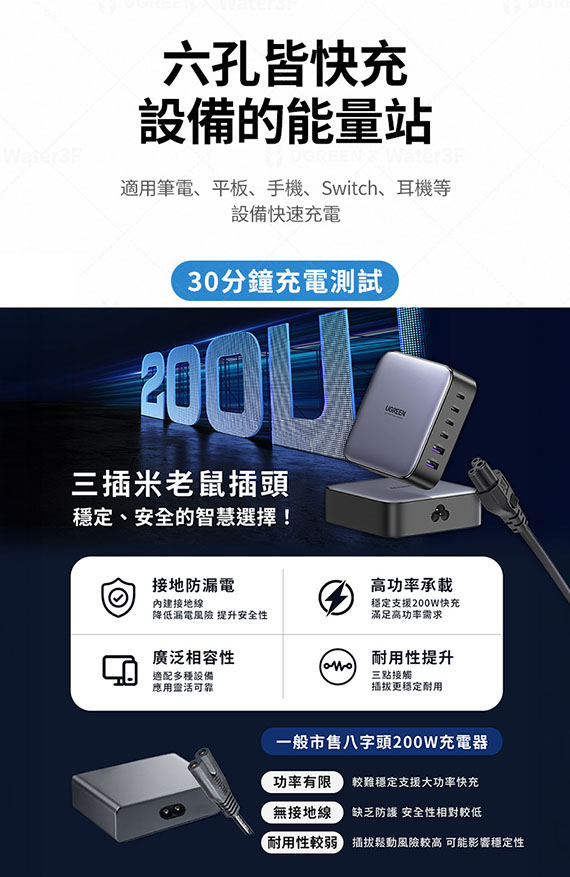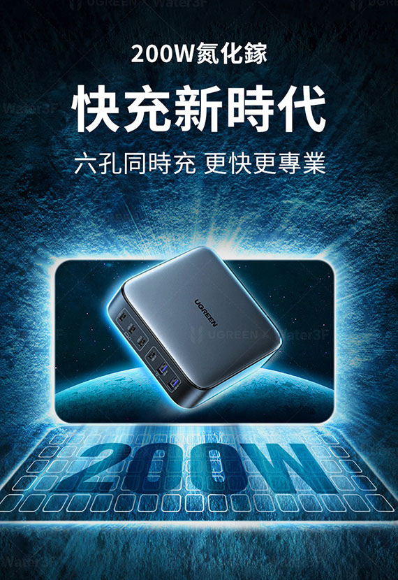 輸入:AC 100~240V 50/60Hz,2.5A、輸出:Type-C*4、Type-A*2、總輸出功率200W、NXP荷蘭恩智浦晶片、GaN氮化鎵技術、支援PD3.0/QC4.0多項快充協議、低溫快充、八大安全防護、內附100W充電線及電源線 BSMI認證碼: R45310