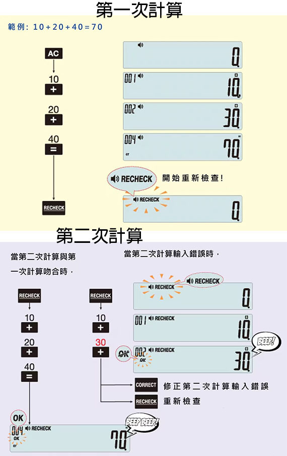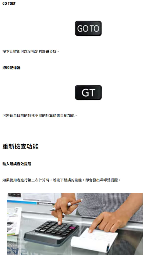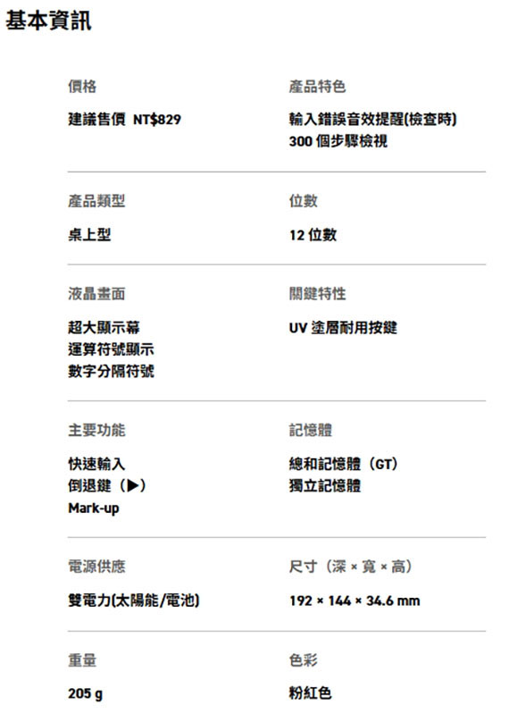 12位數,37按鍵,超大顯示幕,倒退鍵,Mark-up,基本計算,百分比計算,根號計算,300個步驟檢視,輸入錯誤音效提醒(檢查時),顯示格式設定:小數選擇器(4/3/2/1/0/ADD2),捨入選擇器(F、CUT、UP、5/4),雙電力(太陽能+鈕扣鹼性電池LR44x1),尺寸(深寬高):192x144x34.6mm,重量205g,二年保固,BSMI:D33C78 BSMI認證碼: D33C78