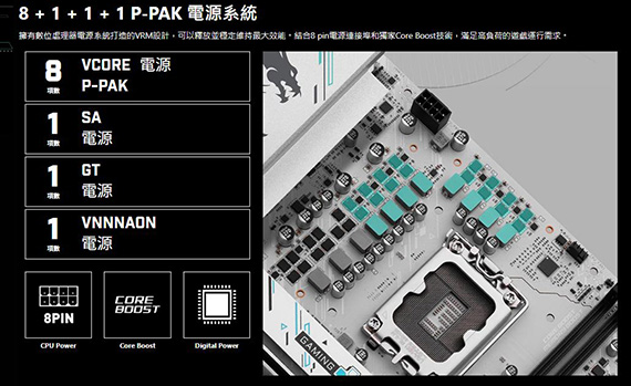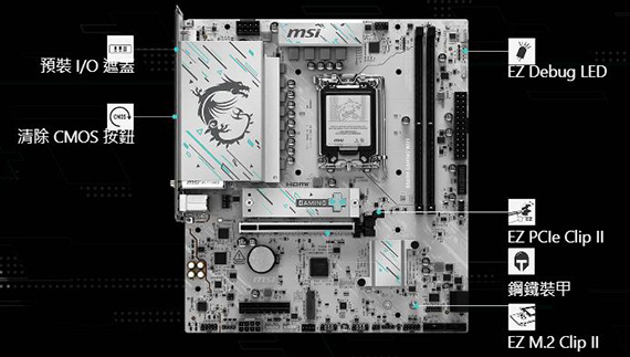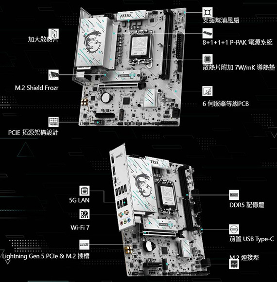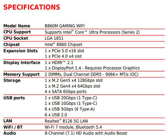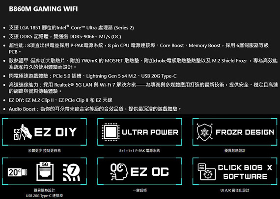INTEL B860,DDR5*2(MAX.128GB),9066-6400(OC)MT/s、6400-4800(JEDEC)MT/s,PCI-E x16 slot*1,PCI-E x4 slot*1,M.2*2,SATA 6G*4,HDMI2.1*1,DisplayPort1.4*1,Realtek 8126 5Gbps LAN,Wi-Fi 7,藍牙5.4,Realtek ALC897 Codec,USB 2.0*6,USB 5Gbps Type A*6,USB 10Gbps Type A*1,USB 10Gbps Type C*1,mATX,LGA 1851需搭配CPU晶片才能使用內顯功能