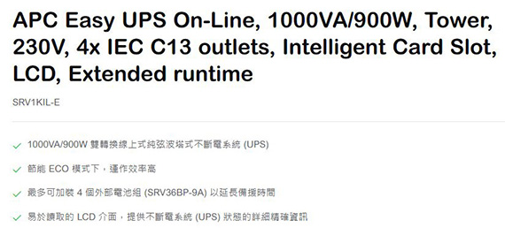 APC SRV1KIL-E Easy UPS On-Line SRV系列 1000VA 230V 在線式不斷電系統