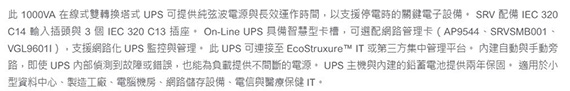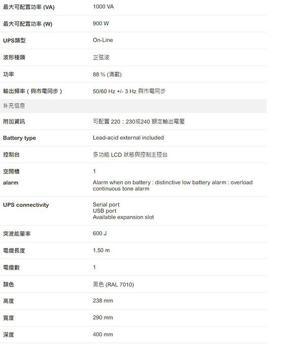 1000VA/900W,輸出電壓230Vac,輸出插座:1 IEC 60320 C13,Intelligent Card Slot,節能ECO模式,易於讀取的LCD介面,提供不斷電系統(UPS),IP 20防護等級,淨重24.6kg,2年保固